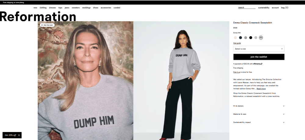 Reformation has many fans, especially among young women. It has 2.5 million followers on Instagram. One item in this new collection stands out: a gray sweatshirt bluntly imploring the wearer, “Dump him.” It may be an admission against interest, if not for me, then at least for my sex, to allow that this might be good advice for some women about some men. And at the right time. Say, before marriage vows are exchanged.